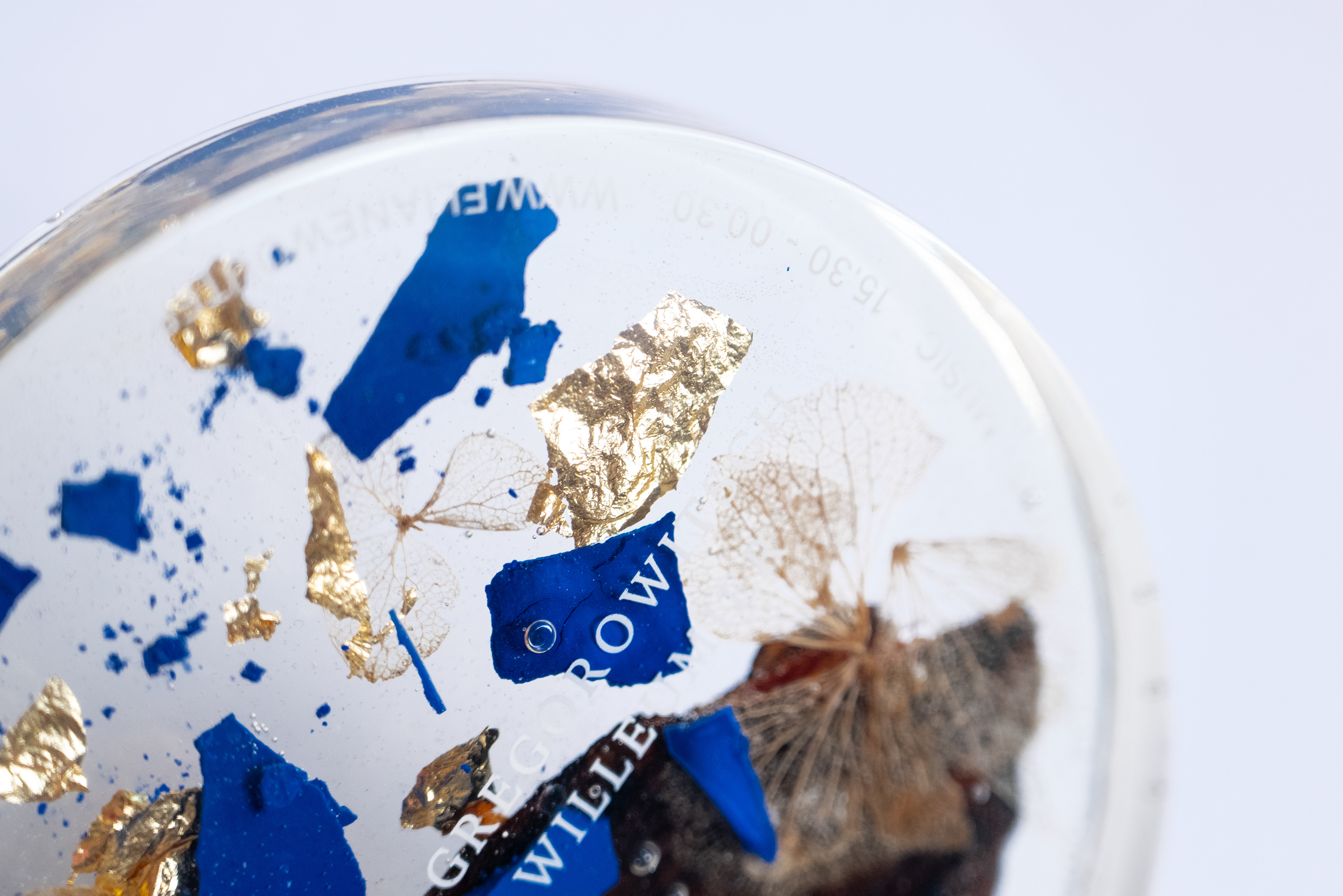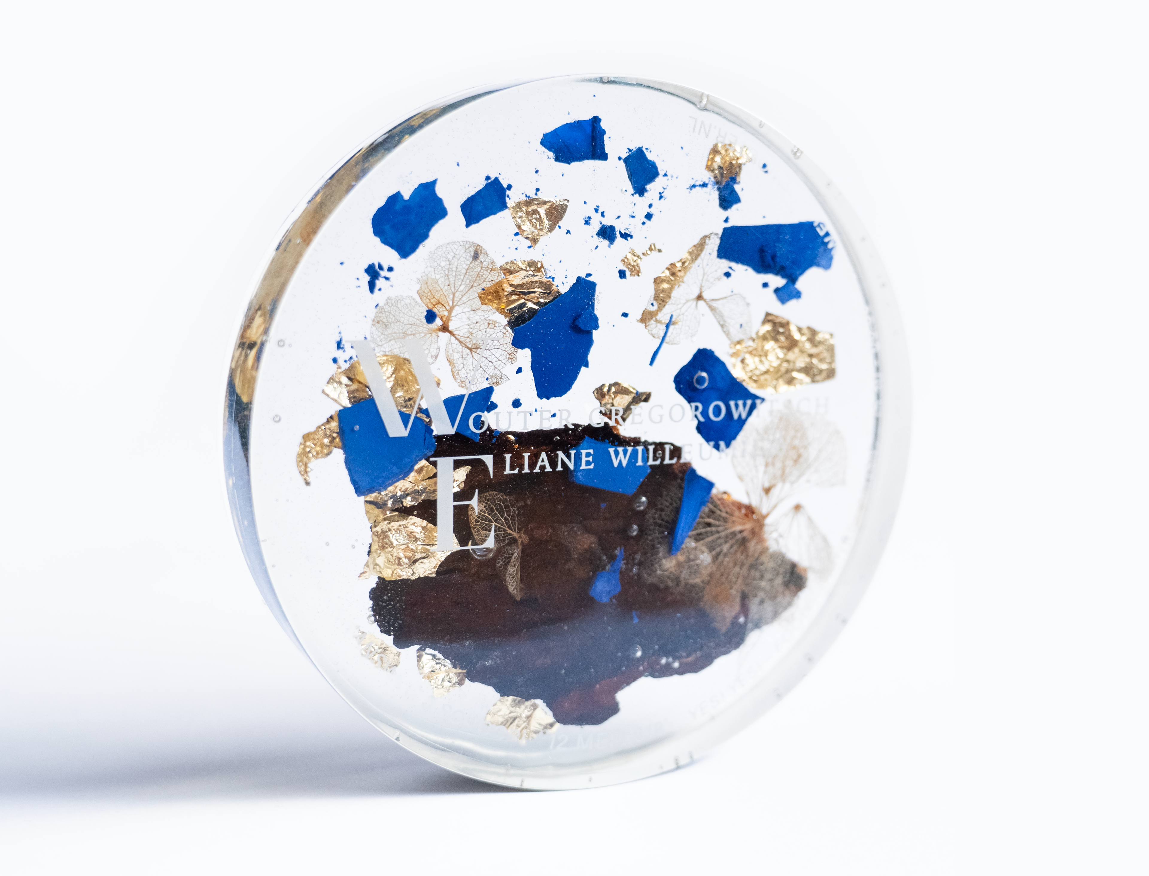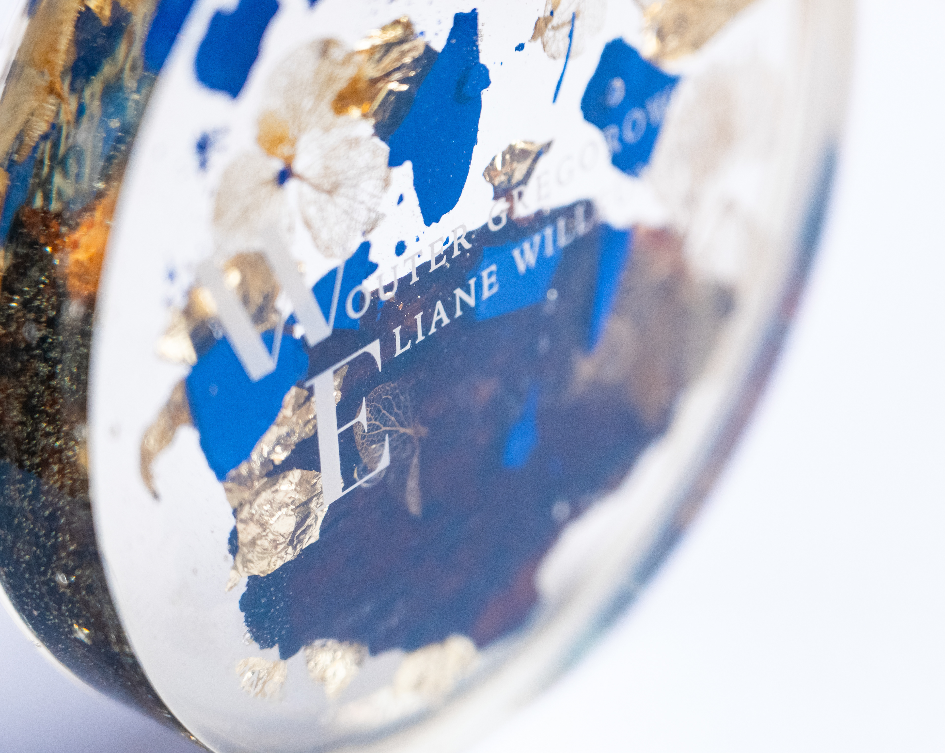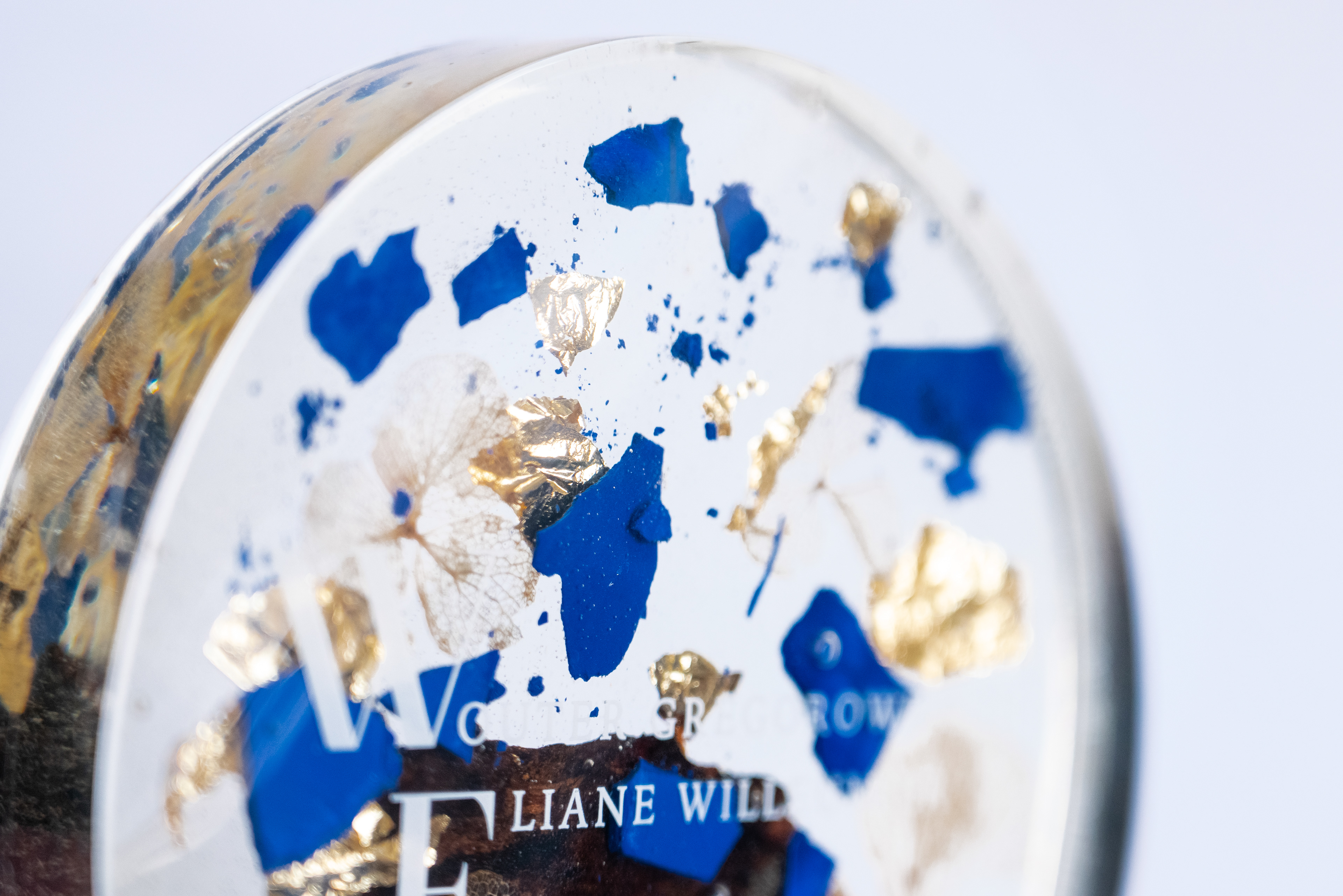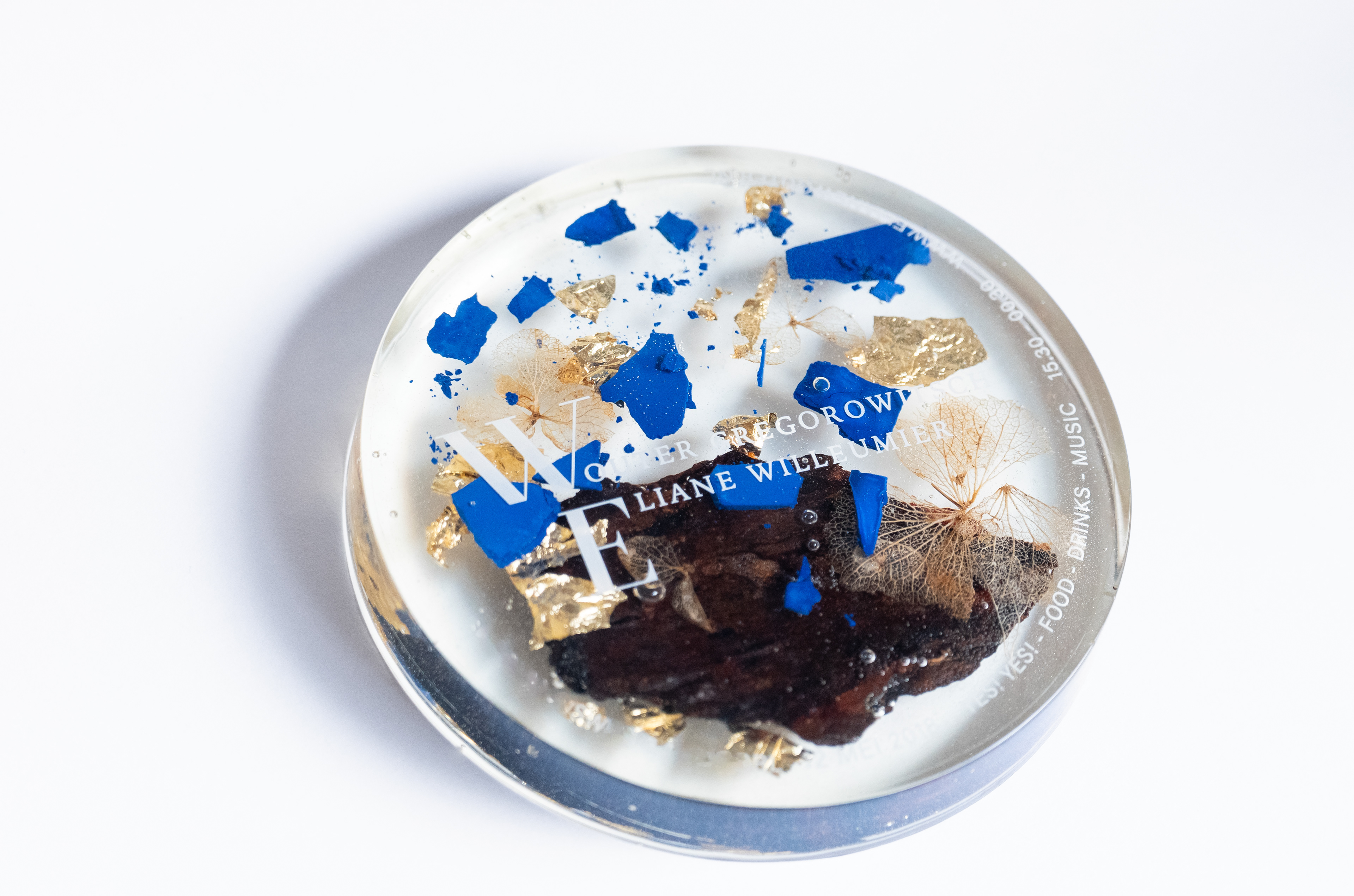 Custom-made wedding invitations combining pieces of wood bark, dried hydrangea flowers, gold leaf and blue paint chips to create unique compositions in discs of non-toxic resin. We also photographed the gold leaf together with the blue paint chips and created matching photo content to be used on the wedding website and for other printed materials. Each guest received a one-of-kind invitation and as it turns out, people are using them as a paper weight or simply as a decorative object.