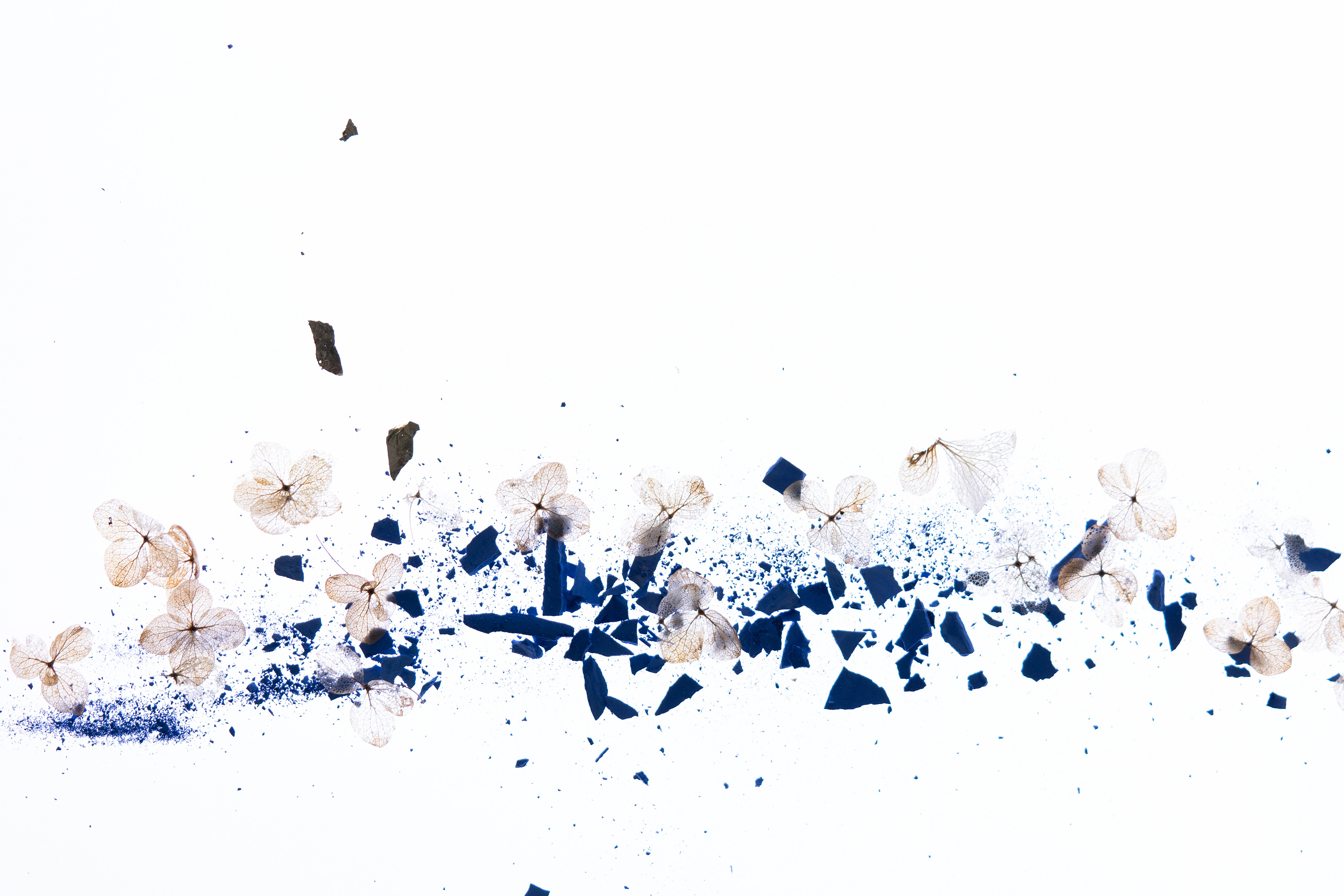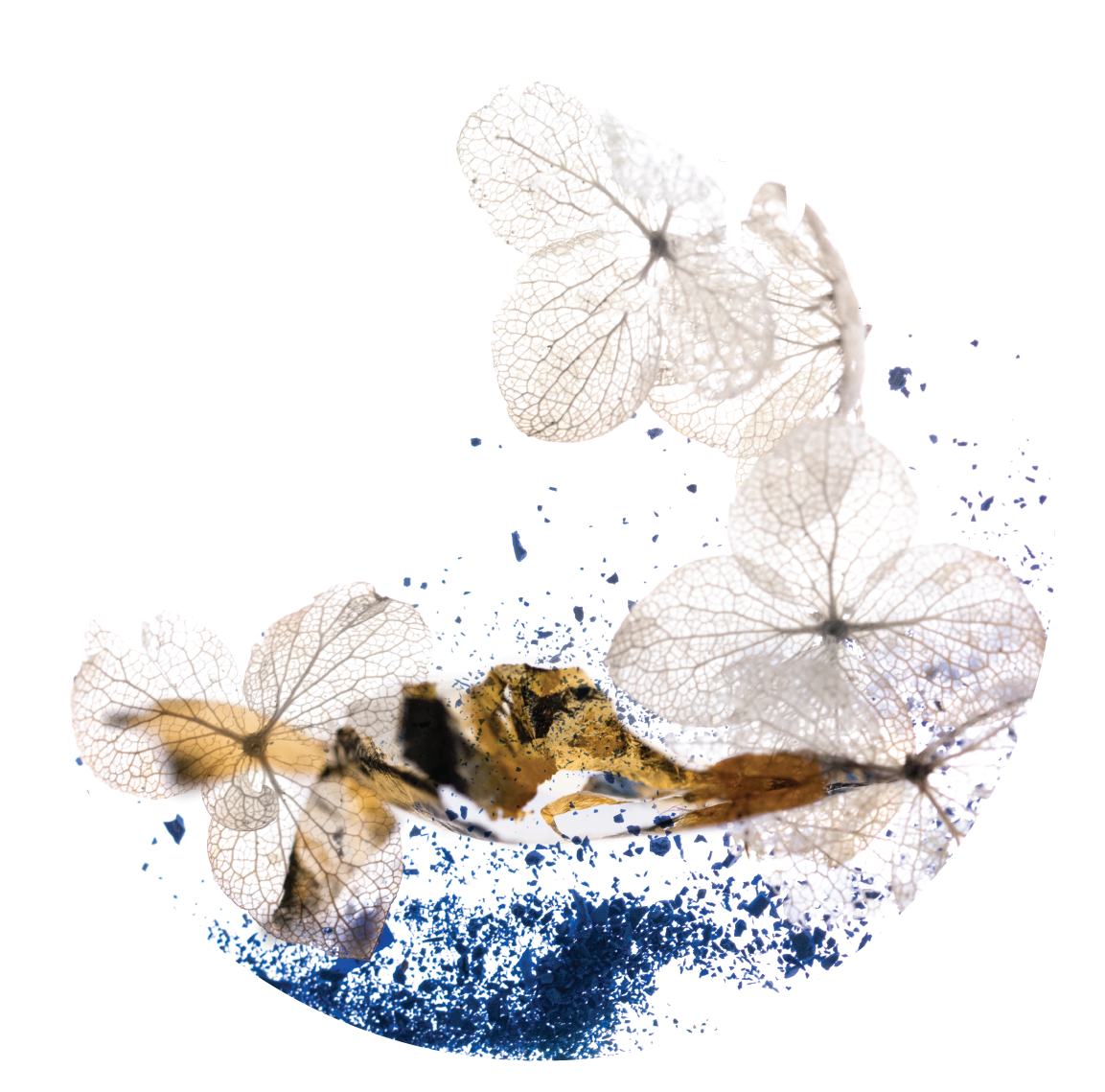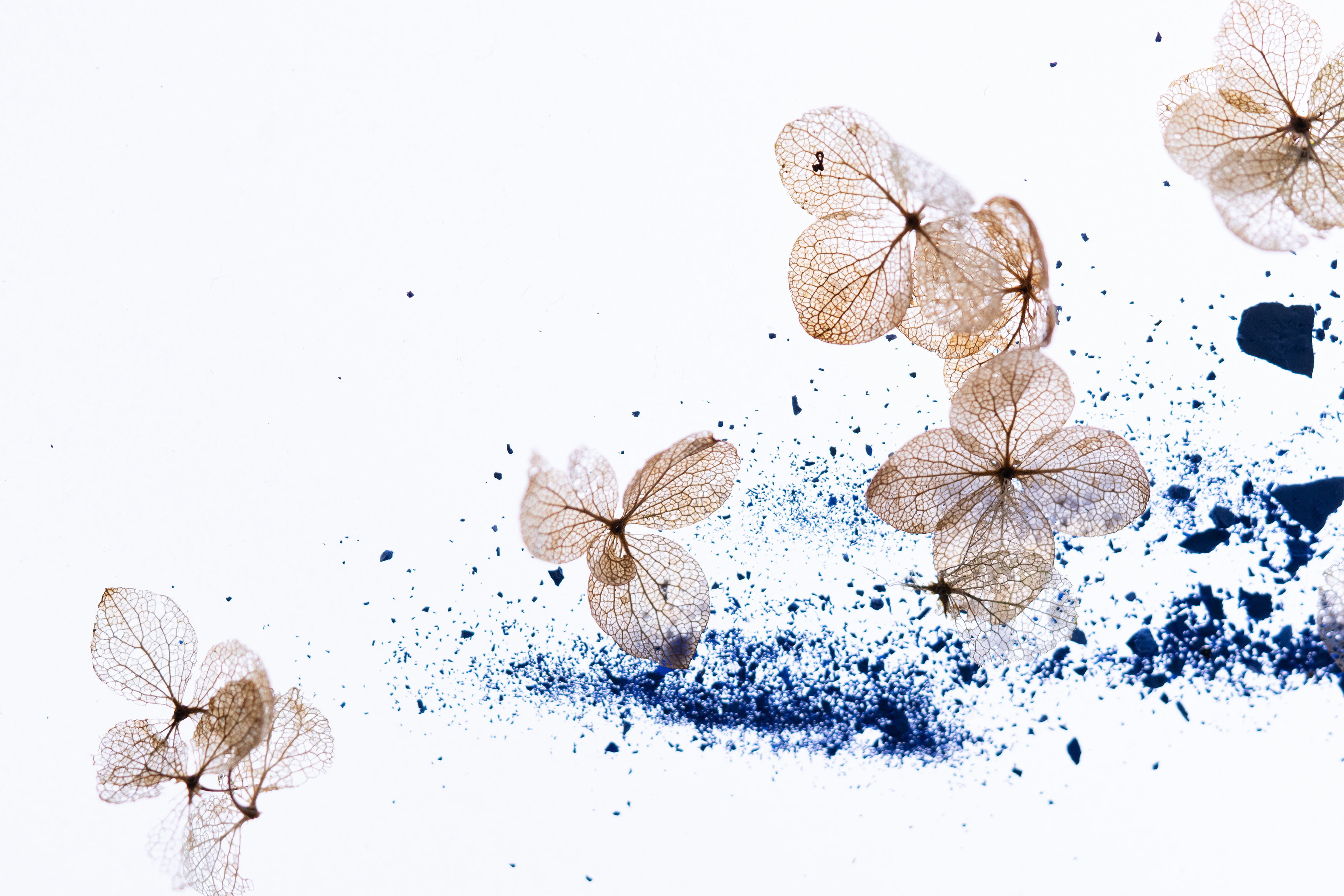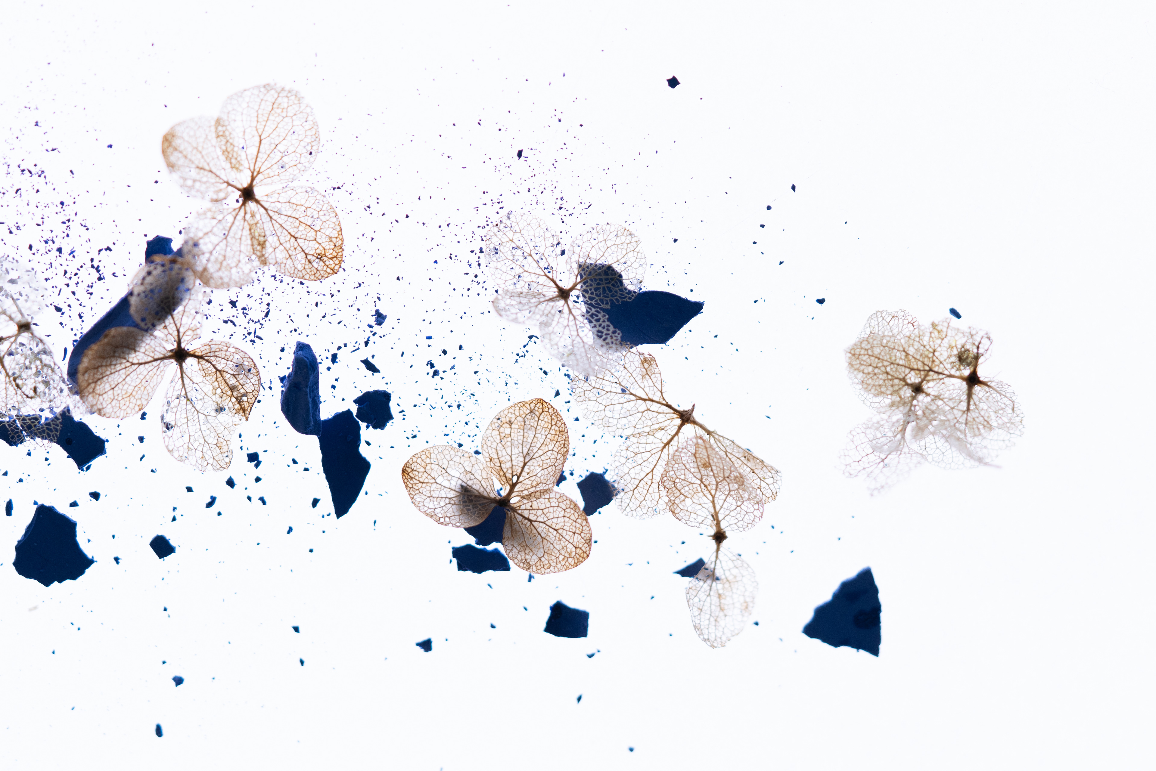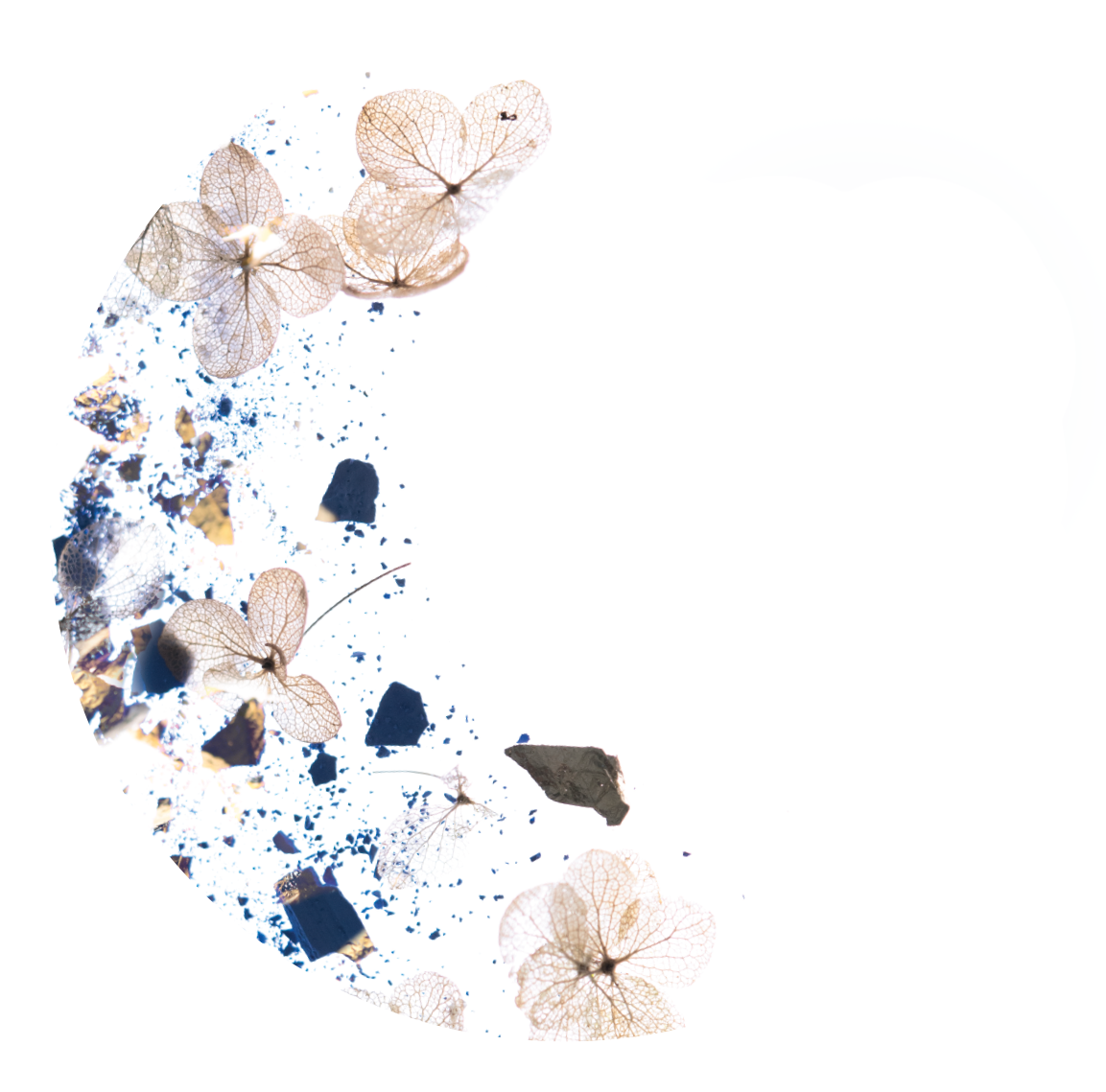 Custom-made wedding invitations combining pieces of wood bark, dried hydrangea flowers, gold leaf and blue paint chips to create unique compositions in discs of non-toxic resin. We also photographed the gold leaf together with the blue paint chips and created matching photo content to be used on the wedding website and for other printed materials. Each guest received a one-of-kind invitation and as it turns out, people are using them as a paper weight or simply as a decorative object.