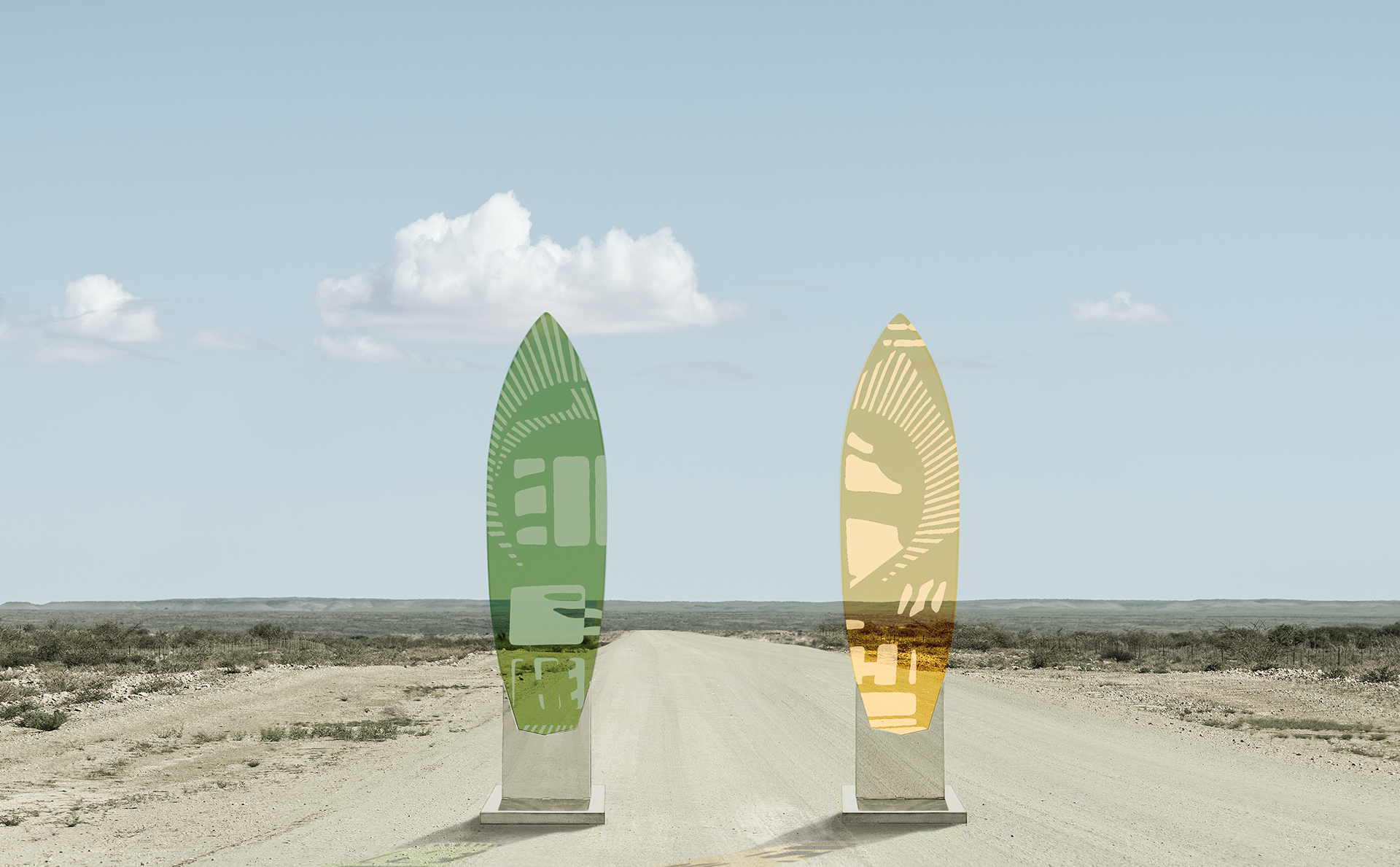 Beyond the surface is a collection of photographic sculptures in the shape of a surfboard. As the surfboard suggests forward movement and exploration we search within our imagery for a visual language that fits this notion of discovering new horizons. The surfboards exist in several different materials; acrylic glass, acrylic dibond, aluminum and wood. The laser engraved acrylic glass surfboards are set in a stainless steel mount, the other surfboards can be displayed on the custom black metal standard or placed without the standard against a wall or mounted on the wall. Whatever suits your wavelength.