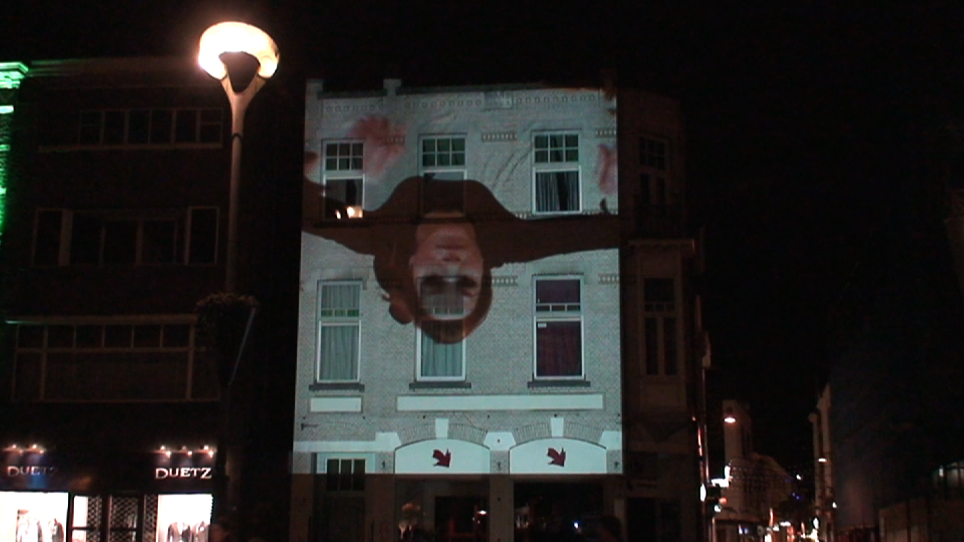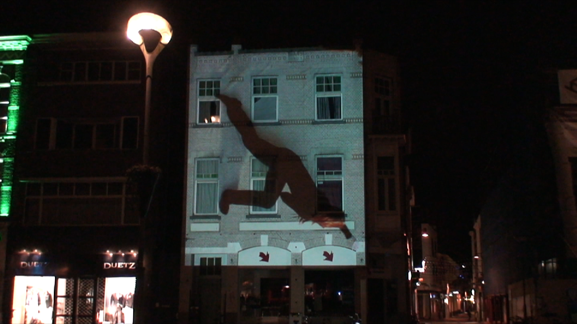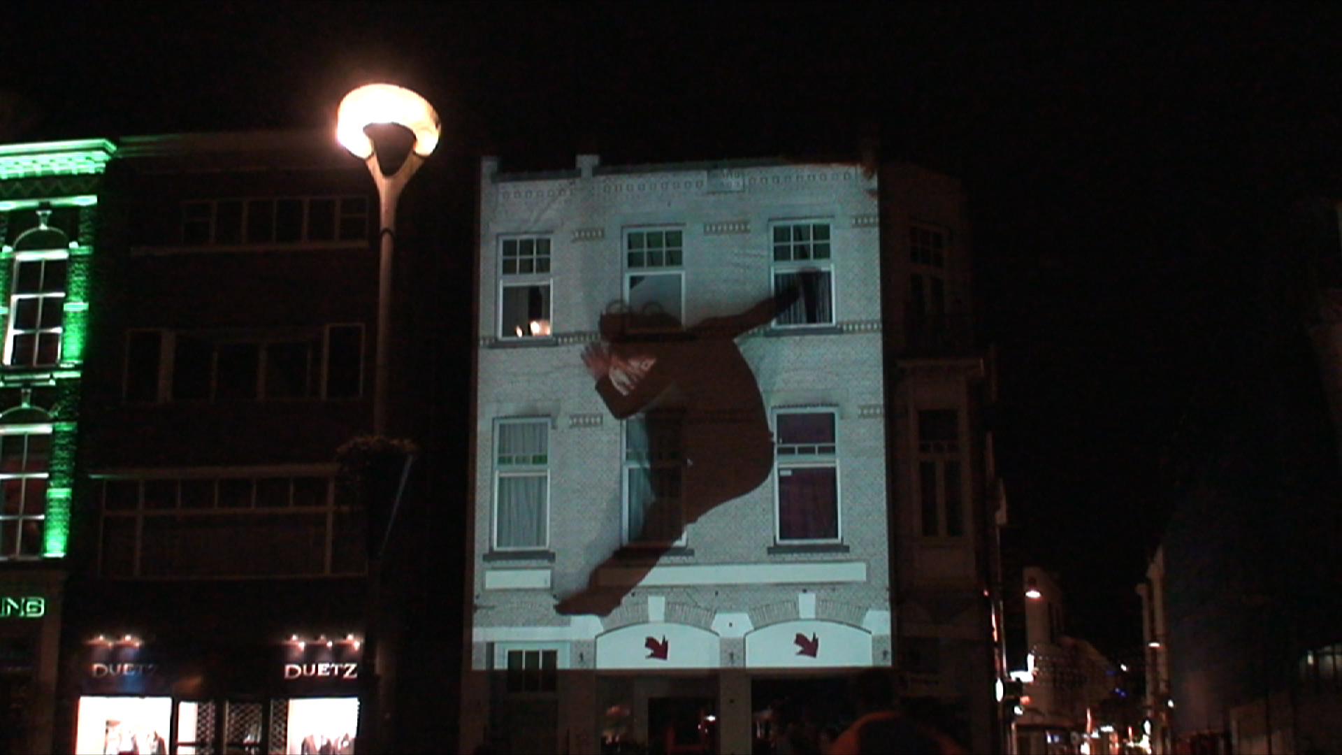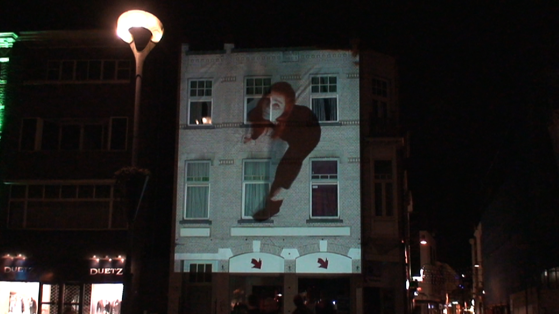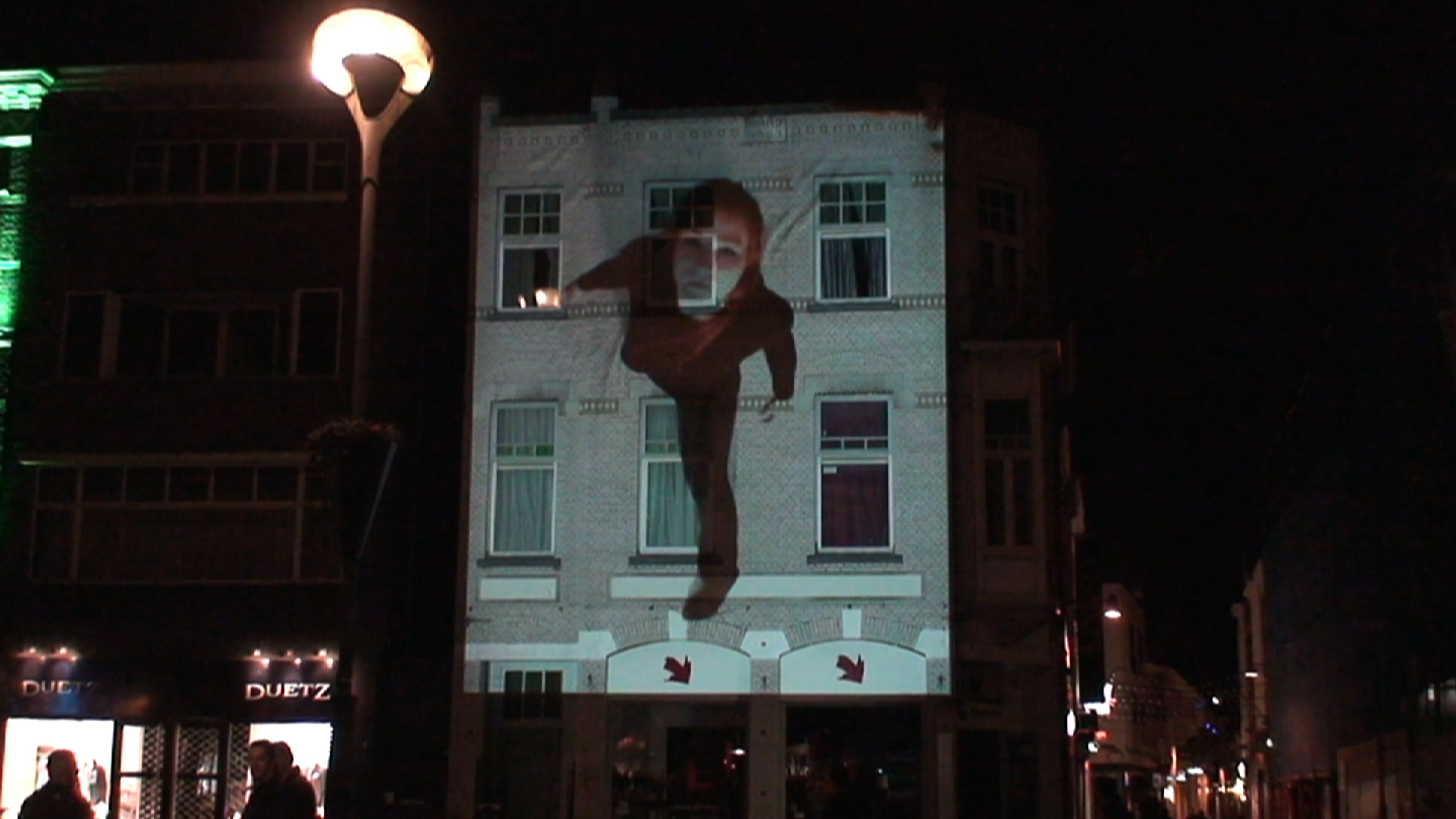 ‘Wild Beaming’ is projecting images on buildings and infrastructure. The project below was part of the program of the International Film Festival in Breda. In this projection you see a figure climbing on the building's facade moving around over the surface, seemingly defying gravity and turning perspective on its head.